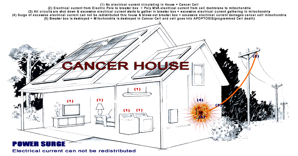 As a result, Poly-MVA continuously delivers EXCESS electrical current (Electrons) to the Mitochondria (Electrical Box) which over time electrocutes/damages the cancer cell (House) causing cell membrane rupture (Cell Death/Apoptosis).