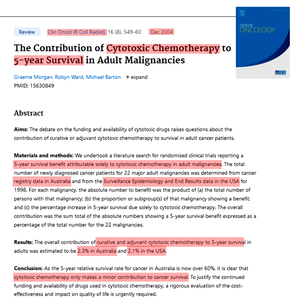 Per this 2004 published article from the Journal of Clinical Oncology, research scientists performed a study to determine the long term benefit of Chemotherapy based on how many patients were still alive after 5 years. The results were miserable. Based on all of the published studies they could review in Australia and the US respectively, the 5 YEAR SURVIVAL RATE in Australia was 2.3% and in the United States, it was even lower at 2.1%.